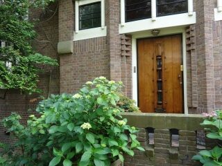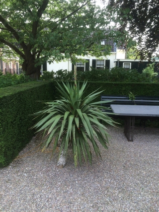 Niet alleen de overtuin maar ook de voortuin is rijkelijk voorzien van stinse bollen. Het snoeienen van de halfronde buxusbollen is elk half jaar weer een nauwkeurige klus. De Yucca is een mooi voorbeeld van een plant die past bij de stijl van het huis.