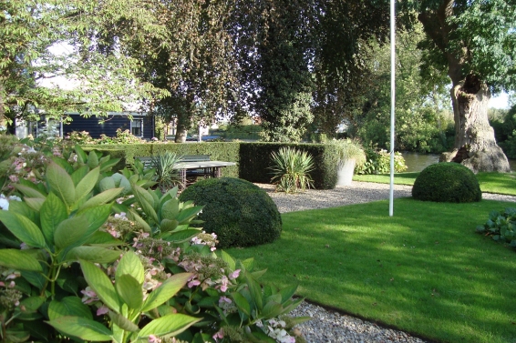 Niet alleen de overtuin maar ook de voortuin is rijkelijk voorzien van stinse bollen. Het snoeienen van de halfronde buxusbollen is elk half jaar weer een nauwkeurige klus. De Yucca is een mooi voorbeeld van een plant die past bij de stijl van het huis.