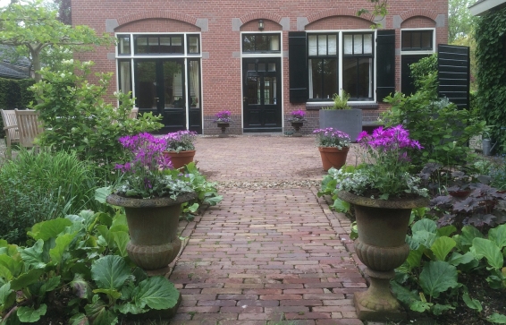 Deze voormalige pastorie heeft een overtuin aan de Vecht. Geheel in stijl met het huis uit de 19e eeuw is er in de overtuin een ovaal verhoogd bloembed aangelegd. De grote bloemenvaas wordt elk half jaar voorzien van seizoensgebonden beplanting zoals knolbegonia’s in de zomer en vele bloembolsoorten in de winter. De overtuinen langs de Vecht werden vroeger o.a. gebruikt voor overslag van goederen die aangeveoerd werden via de rivier. Van gebruikstuin naar siertuin.