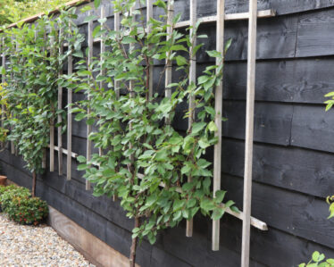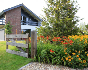 In het kleinschalige veenlandschap van Kortenhoef ligt een groen paradijsje waar je helemaal tot rust kunt komen. Om vrienden en familie in grote getalen te kunnen ontvangen is er aan de voorkant van het terrein een groot grindplein aangelegd dat begrensd wordt door kleurige borders waar het hele jaar door boeketten van worden geplukt. Niet alleen bloemen, maar ook groenten kunnen uit deze tuin worden geoogst dankzij de luwgelegen moestuin. De geleide morel groeit en bloeit goed op de noordelijk gelegen zwarte schutting. Deze plant houdt zijn vorm door het traditionele eikenhouten trelliswerk. Geheel in stijl met de bungalow uit de jaren ’70 is er gekozen voor leisteen om het terras mee aan te leggen. De rest van de verhardingen bestaat uit traditioneel meerkleurig grind.