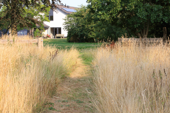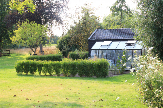 Het achterliggende grasland is een vochtige weide die grenst aan het natuurlijke veengebied, dat alleen toegankelijk is met een kano. Een natuurlijk element waar de bewoners dankbaar gebruik van maken. Zowel het speciaal gebouwde botenhuis annex schuur als de kas zijn ontworpen om op te gaan in de tuin, zowel qua materiaalgebruik als de cultuurhistorische kleur. Schuren in gebied waren traditioneel zwart geteerd. Ook worden het gras en bloeiende kruiden van het weiland hoogzomer gemaaid en gebruikt als natuurlijk paardenvoer. Gedurende de groei van het lange gras worden er systematisch paden gemaaid zodat het romantische zitplekje onder de treurwilg bereikbaar blijft. In de vroege ochtend en de late avond zijn er vele vogels en andere wilde dieren te spotten.