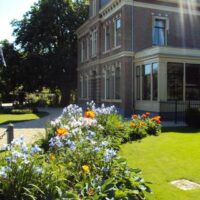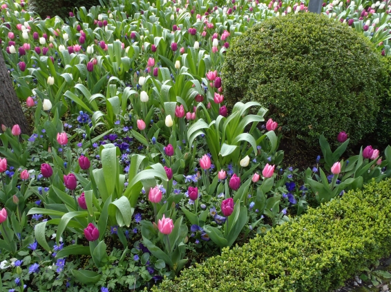 De grote eikenbomen langs de grasvelden geven de tuin een beschut gevoel. Op open plekken verschijnt er in het voorjaar een grote diversiteit aan bloembollen. Vanaf februari tot juni bloeien de bloembollen.