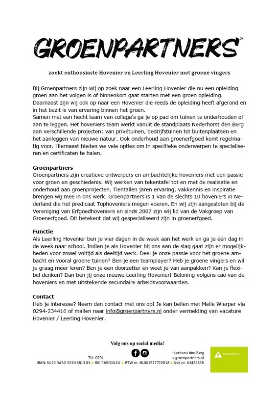 VACATURE: Leerling Hovenier Ben jij een Leerling Hovenier die bezig met een groenopleiding? Wij zijn op zoek naar collega’s! Categorie: VacaturesBericht navigatieVorigeVorig berichtLezingen